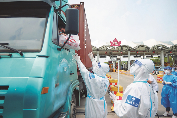 以“同心抗疫 我們在行動”為主題的貨車司機關愛活動最近在我省多地開展,志愿者們?yōu)樨涇囁緳C送去“抗疫愛心包”,提供暖心服務。圖為20日,在南京繞城高速棲霞收費站出口,志愿者向貨車司機送上“抗疫愛心包”。本報記者 陳儼 攝