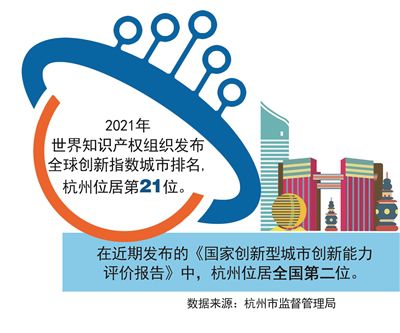 2021年以來,杭州知識產(chǎn)權工作堅持以數(shù)字化改革為引領,以推動高質(zhì)量發(fā)展為目標,著力完善體系,持續(xù)協(xié)同發(fā)力,為高質(zhì)量發(fā)展建設共同富裕示范區(qū)城市范例提供了有力支撐。截至2021年底,杭州市有效發(fā)明專利擁有量9.5萬件,居全國省會城市第一,其中,高價值發(fā)明專利39842件,占比41.9%;杭州市有效注冊商標102.56萬件,居全國省會城市第二;2021年浙江省設區(qū)市知識產(chǎn)權保護工作考核優(yōu)秀,位居第一;2021年世界知識產(chǎn)權組織發(fā)布全球創(chuàng)新指數(shù)城市排名,杭州位居第21位;在近期發(fā)布的《國家創(chuàng)新型城市創(chuàng)新能力評價報告》中,杭州位居全國第二位。