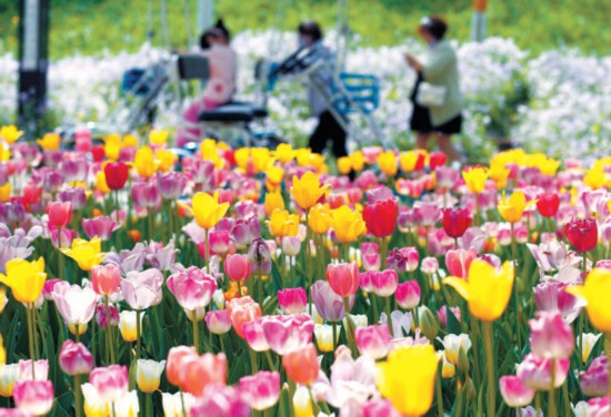 昨天,三三兩兩的游人漫步在世界花卉大觀園的郁金香花海中,感受暮春時(shí)節(jié)的色彩斑斕。園內(nèi)37種近20萬(wàn)株郁金香,正在陸續(xù)開(kāi)放。世界花卉大觀園還將舉辦首屆郁金香插花花藝大賽,貼近市民家庭園藝需求。 本報(bào)記者 劉平攝