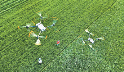 河南省尉氏縣植保隊員在麥田進(jìn)行“一噴三防”作業(yè),與傳統(tǒng)方式相比,無人機噴灑可減少農(nóng)藥使用量。