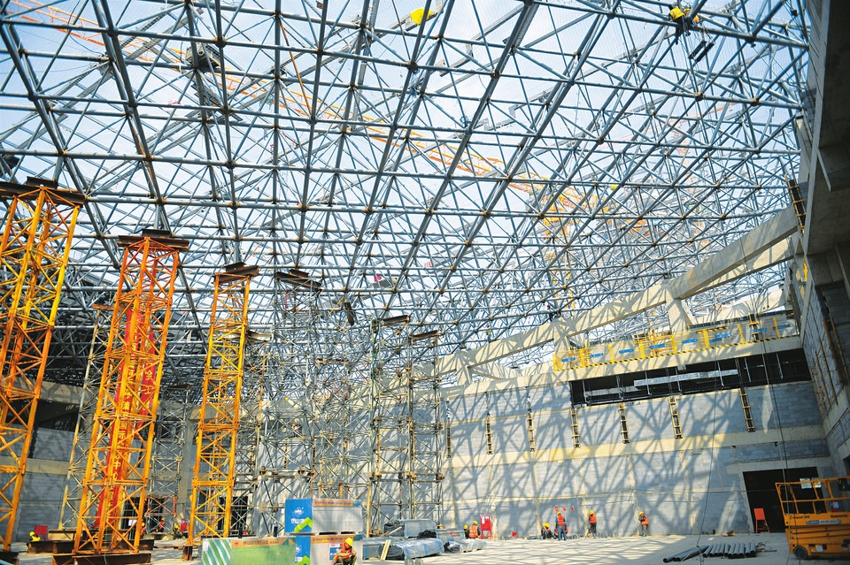 4月24日,瀟河國際會(huì)議中心建設(shè)現(xiàn)場(chǎng),施工人員在做好疫情防控的基礎(chǔ)上,嚴(yán)守安全生產(chǎn)底線,搶抓施工進(jìn)度。(記者王瑞瑞攝)