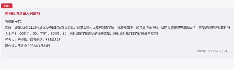 秀洲區(qū)洪合鎮(zhèn)人民政府對此高度重視,并于4月24日進(jìn)行了回應(yīng),并回復(fù)稱,經(jīng)洪合鎮(zhèn)人民政府調(diào)查了解,已與徐女士進(jìn)行了溝通協(xié)調(diào),目前已將徐女士所住小區(qū)附近的反詐、防疫智慧喇叭的播放時間調(diào)整為上午8:00至11:00,以及下午1:30至5:30,同時調(diào)低了該喇叭的播放音量。