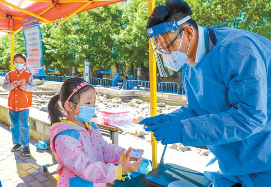 昨天清晨,天剛蒙蒙亮,鄭爍就到達(dá)集結(jié)點(diǎn)位。核酸檢測(cè)開始后,鄭爍主要負(fù)責(zé)現(xiàn)場(chǎng)秩序維護(hù)引導(dǎo)、掃碼登記、查驗(yàn)健康寶、協(xié)助老年人做好信息登記等工作?!白蛱毂本┑淖罡邭鉁剡_(dá)到32攝氏度,核酸檢測(cè)期間,我們志愿者小組為上千位居民提供了服務(wù),這期間一個(gè)跟著媽媽來做核酸的小女孩每路過一位志愿者都會(huì)主動(dòng)說一聲‘叔叔阿姨,辛苦了!’聽著孩子甜美的問候,再累也值了!”鄭爍告訴記者。