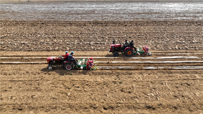 朔城區(qū)南榆林鄉(xiāng)青鐘村玉米核心區(qū)播種現(xiàn)場,應(yīng)用了膜側(cè)播種技術(shù)的播種機(jī)在田間播種作業(yè)。高文武 攝