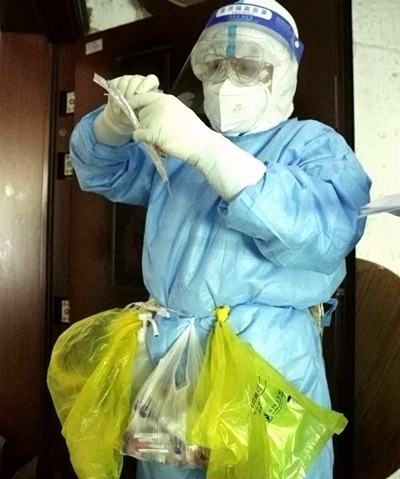 5月2日早上9點(diǎn)不到,劉彩麗來到小區(qū)門口,穿戴好防護(hù)服,腰上綁好采樣工具包、消毒用具,進(jìn)入封控區(qū)為居民進(jìn)行核酸采樣。小區(qū)是5層的老舊樓房,沒有電梯,裹著防護(hù)服的劉彩麗爬上頂樓時(shí)已經(jīng)氣喘吁吁,倚著欄桿平穩(wěn)了一下呼吸,輕輕敲著居民門,準(zhǔn)備投入采樣工作。經(jīng)過多輪核酸采樣,劉彩麗和居民早已熟稔。