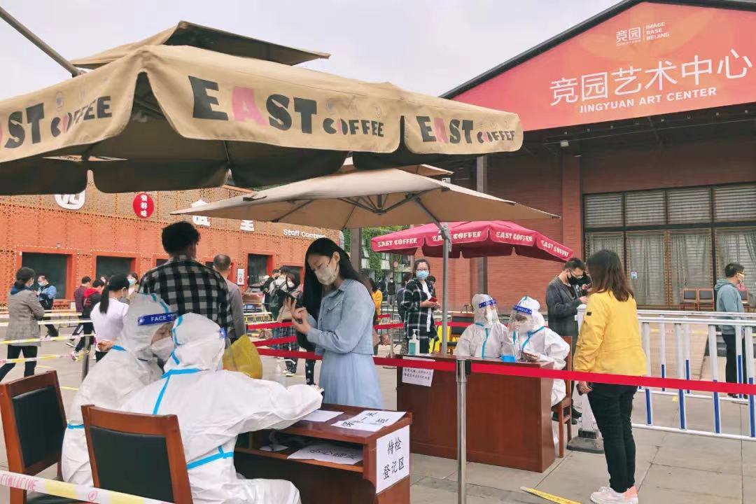 在通惠河畔文化創(chuàng)意產(chǎn)業(yè)園核酸檢測點(diǎn),一枚枚紅色“黨員志愿服務(wù)”袖標(biāo)格外醒目。