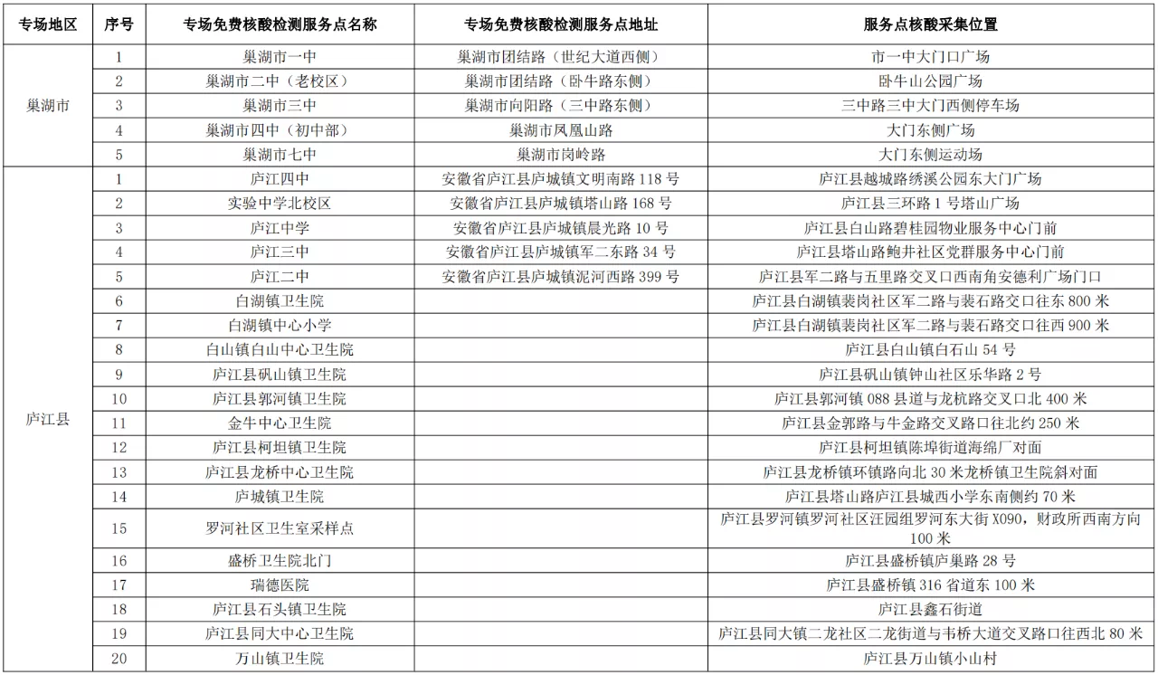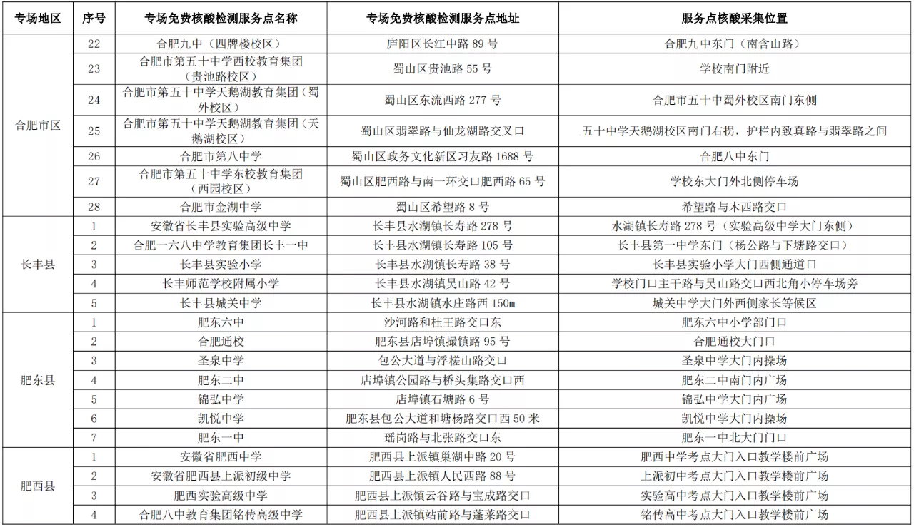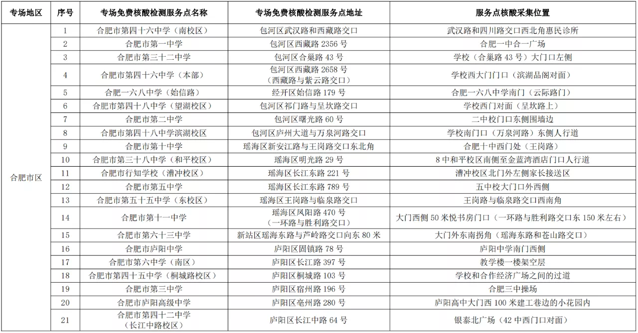 根據(jù)要求,各專場免費核酸檢測服務(wù)點僅對合肥市高考考生提供服務(wù),考生可持準考證、安康碼就近到專場免費核酸檢測服務(wù)點進行核酸采樣,具體檢測點主要設(shè)在高考考點周邊。