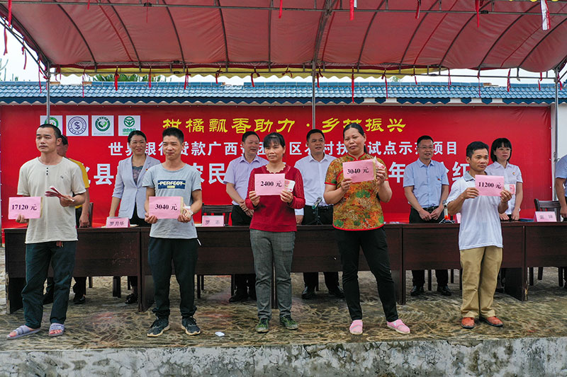 正在布置分紅現(xiàn)場的東皇嶺農(nóng)民專業(yè)合作社理事長覃順從說:“世行項目大化縣東皇嶺農(nóng)民專業(yè)合作社今天召開2021年年度分紅大會,給175戶入股社員發(fā)放80萬元分紅,下一步我們將和世行項目深入合作,擴大我們的農(nóng)業(yè)產(chǎn)業(yè)基地,實現(xiàn)鄉(xiāng)村振興農(nóng)民增收的雙贏目標(biāo)?!?/p>