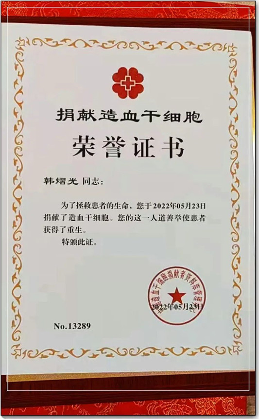 作為一名黨員,韓熠光一直熱心公益。2001年參與無償獻(xiàn)血,累計獻(xiàn)血量達(dá)1400毫升;2008年,他選擇成為一名中華骨髓庫志愿捐獻(xiàn)者;2022年,成為了海南省第144例捐獻(xiàn)造血干細(xì)胞的英雄……