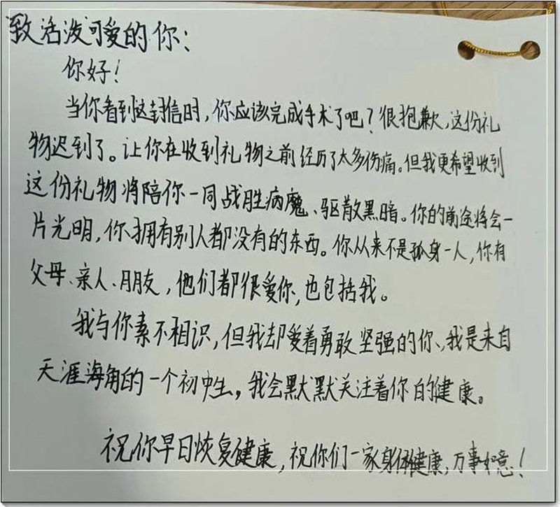 韓熠光女兒寫給受助男孩的祝福信。海南省紅十字會供圖