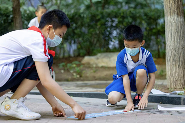 陶然亭街道大吉巷社區(qū)的一處核酸點(diǎn)位上,兩米線安全提示標(biāo)識(shí)引起大伙兒注意?!氨苊饩奂瑖?yán)防疫情”“綠色出行,愛心助考”“文明陪考,安全第一”……誰能想到這些醒目的標(biāo)語竟然是“陶然娃”們想的“愛心助考公約”?!榜R上就是高考了,希望哥哥姐姐們能取得好成績(jī),不辜負(fù)自己多年的努力?!?3歲的陳博一趴在地上,奮力的拍了拍自己剛剛貼好的“公約宣傳條”。