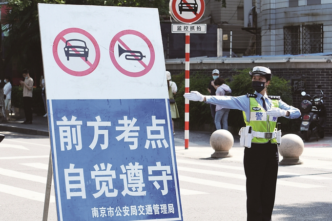 “今年考生家長大多選擇地鐵、公交等公共交通工具到達考點,周邊居民和在附近上班的人員也都能理解配合,高考現(xiàn)場環(huán)境一年比一年好?!蹦暇┙痪淮箨爤?zhí)勤二中隊中隊長錢臣表示??键c現(xiàn)場,交警也對非機動車駕駛?cè)藛T進行友情提醒,請他們不要按喇叭。在南京市第一中學(xué)考點,南京交警三大隊副大隊長桂子振告訴記者,“下午1點,我們就在考點周邊路口安排3名民警巡邏?!痹诟骺键c周邊道路,交警均擺放了疏導(dǎo)車輛的交通標(biāo)志,并實時為考生提供幫助。