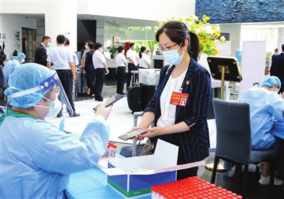 因新冠疫情防控需要,此次黨代會(huì)實(shí)行全程閉環(huán)管理?!罢?qǐng)您先測(cè)一下體溫?!惫ぷ魅藛T熱情地引導(dǎo)著。代表們佩戴口罩,保持間距,有序完成測(cè)溫、驗(yàn)碼、安檢、流調(diào)、核酸檢測(cè),隨后全身心投入到參會(huì)各項(xiàng)準(zhǔn)備工作。