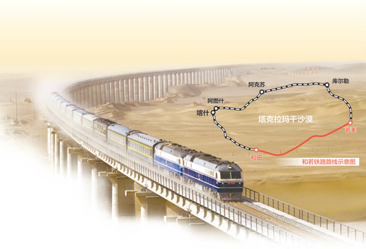 作為國家重點(diǎn)鐵路建設(shè)項(xiàng)目,和若鐵路西起新疆和田地區(qū)和田市,東至巴音郭楞蒙古自治州若羌縣,全長(zhǎng)825公里,設(shè)計(jì)時(shí)速120公里。和若鐵路開通后,與南疆鐵路、格庫鐵路相連,全長(zhǎng)2712公里,形成世界首個(gè)沙漠鐵路環(huán)線。