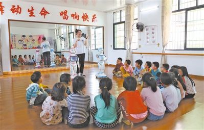 湖南新田縣彭梓城村小學(xué),老師指導(dǎo)孩子使用智能教育機器人進行編程和學(xué)習(xí)。