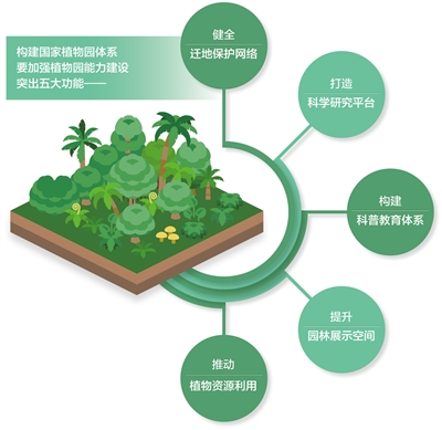 “構(gòu)建國家植物園體系,要加強(qiáng)植物園能力建設(shè),突出五大功能?!敝苤救A介紹,一是健全遷地保護(hù)網(wǎng)絡(luò),建立野生植物遷地保護(hù)栽培繁育體系、遷地保護(hù)信息平臺和綜合保藏體系,提升遷地保護(hù)綜合保藏能力,這是核心功能;二是打造科學(xué)研究平臺,開展遷地保護(hù)基礎(chǔ)科學(xué)研究活動,加強(qiáng)植物保護(hù)國際國內(nèi)交流合作,持續(xù)推進(jìn)植物保護(hù)專業(yè)人才培養(yǎng);三是構(gòu)建科普教育體系,建設(shè)科普教育平臺,實(shí)施科普教育培訓(xùn)計(jì)劃;四是提升園林展示空間,創(chuàng)新園林園藝展示方式,促進(jìn)公眾深入了解和支持國家植物園建設(shè);五是推動植物資源利用,加大引種馴化和新品種開發(fā)力度,提升城市生態(tài)建設(shè)和產(chǎn)業(yè)服務(wù)水平。