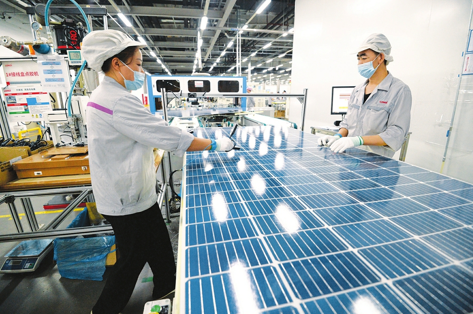 7月15日,大同隆基光伏科技有限公司光伏面板生產(chǎn)線上,工人們正在對(duì)產(chǎn)品進(jìn)行最后檢測。該公司規(guī)劃布局了3條自動(dòng)化生產(chǎn)線,引入目前行業(yè)內(nèi)先進(jìn)的生產(chǎn)設(shè)備和技術(shù)工藝。全部建成投產(chǎn)后,預(yù)計(jì)年產(chǎn)值約30億元。(記者李兆民攝)