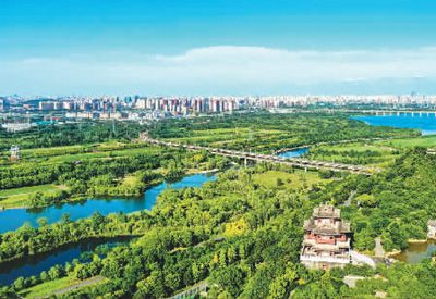 圖一:藍綠交織的永定河北京豐臺段。本報記者 賀 勇攝