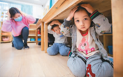 圖四:江蘇省南京市雨花臺區(qū)龍福幼兒園小朋友們學習防災減災自救技能。蘇陽攝(人民視覺)