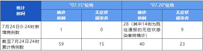 “07.15”疫情新增本土確診病例1例,無(wú)新增本土無(wú)癥狀感染者,系隔離管控中的密切接觸者。截至24日24時(shí),本起疫情累計(jì)報(bào)告本土確診病例59例、本土無(wú)癥狀感染者15例。