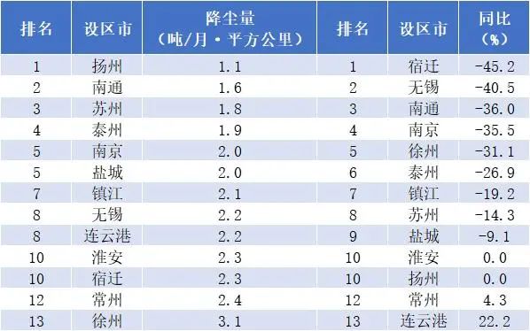 降塵量改善幅度由好到差依次排序?yàn)椋核捱w、無錫、南通、南京、徐州、泰州、鎮(zhèn)江、蘇州、鹽城、淮安(揚(yáng)州并列)、常州、連云港。