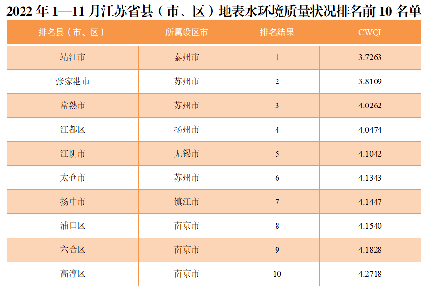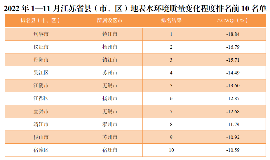 地表水環(huán)境質(zhì)量改善幅度相對(duì)較快的前10位(1—10名)依次是句容市、儀征市、丹陽(yáng)市、吳江區(qū)、江陰市、江都區(qū)、宜興市、靖江市、昆山市、宿豫區(qū)。