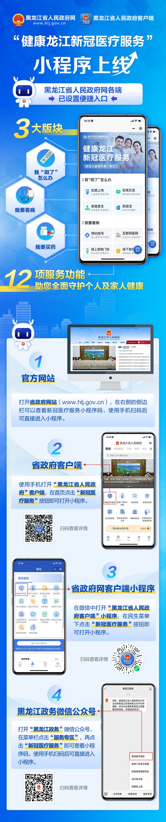 “健康龍江新冠醫(yī)療服務(wù)”小程序已經(jīng)正式上線,為了讓全省人民更加便捷地找到小程序,及時(shí)獲取服務(wù),黑龍江省人民政府網(wǎng)站、官方客戶端、小程序、官方微信公眾號(hào)等平臺(tái)已全面開通“健康龍江新冠醫(yī)療服務(wù)”便捷入口。3大板塊12項(xiàng)服務(wù)功能助您全面守護(hù)個(gè)人及家人健康。