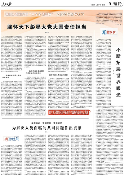 中國(guó)共產(chǎn)黨是為中國(guó)人民謀幸福、為中華民族謀復(fù)興的黨,也是為人類(lèi)謀進(jìn)步、為世界謀大同的黨。我們要拓展世界眼光,深刻洞察人類(lèi)發(fā)展進(jìn)步潮流,積極回應(yīng)各國(guó)人民普遍關(guān)切,為解決人類(lèi)面臨的共同問(wèn)題作出貢獻(xiàn),以海納百川的寬闊胸襟借鑒吸收人類(lèi)一切優(yōu)秀文明成果,推動(dòng)建設(shè)更加美好的世界。深刻認(rèn)識(shí)和把握“六個(gè)必須堅(jiān)持”系列理論版今天推出第六期,圍繞“必須堅(jiān)持胸懷天下”進(jìn)行闡述。