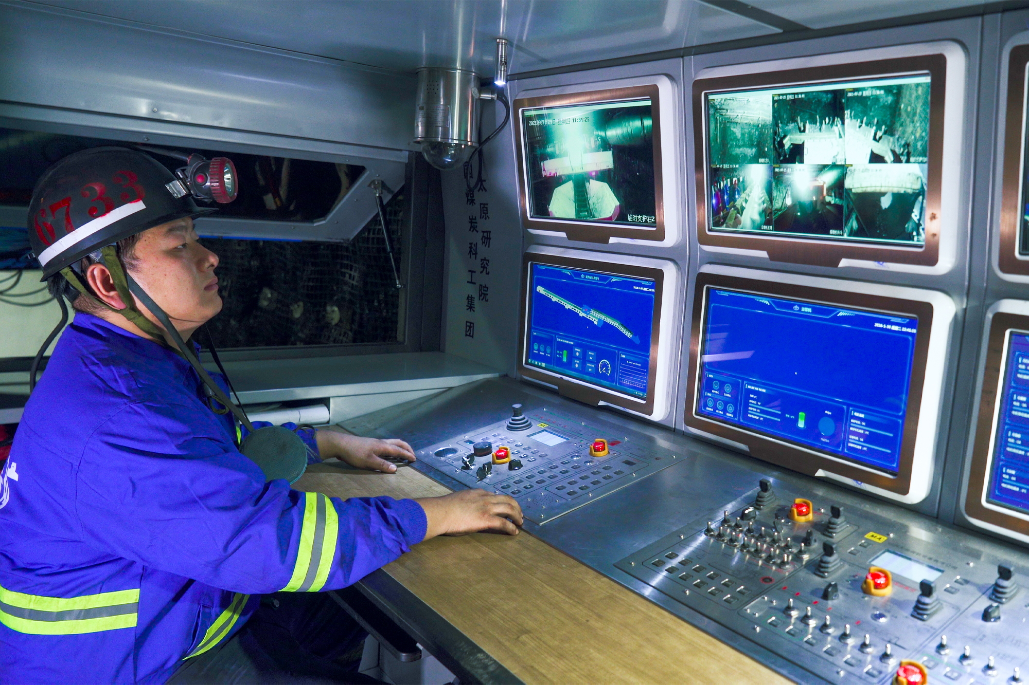 煤礦工人操控“煤海蛟龍”進(jìn)行巷道掘進(jìn)。(黃陵礦業(yè)二號(hào)煤礦供圖)