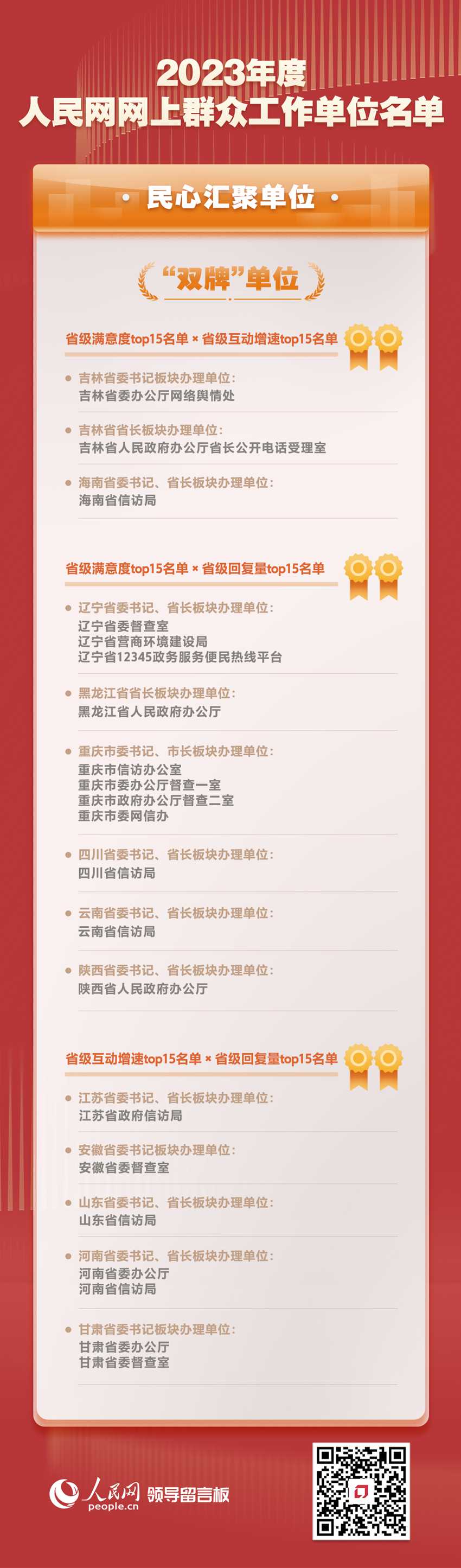此次公布的名單綜合全國各地區(qū)各部門各單位近一年來的滿意度、互動增速、回復(fù)量等指數(shù),著重突出各地區(qū)各部門各單位依托人民網(wǎng)“領(lǐng)導(dǎo)留言板”開展網(wǎng)上群眾工作情況,選出2023年度人民網(wǎng)網(wǎng)上群眾工作“民心匯聚單位”“實干擔(dān)當(dāng)單位”“匯智為民單位”和“活力奮進單位”。