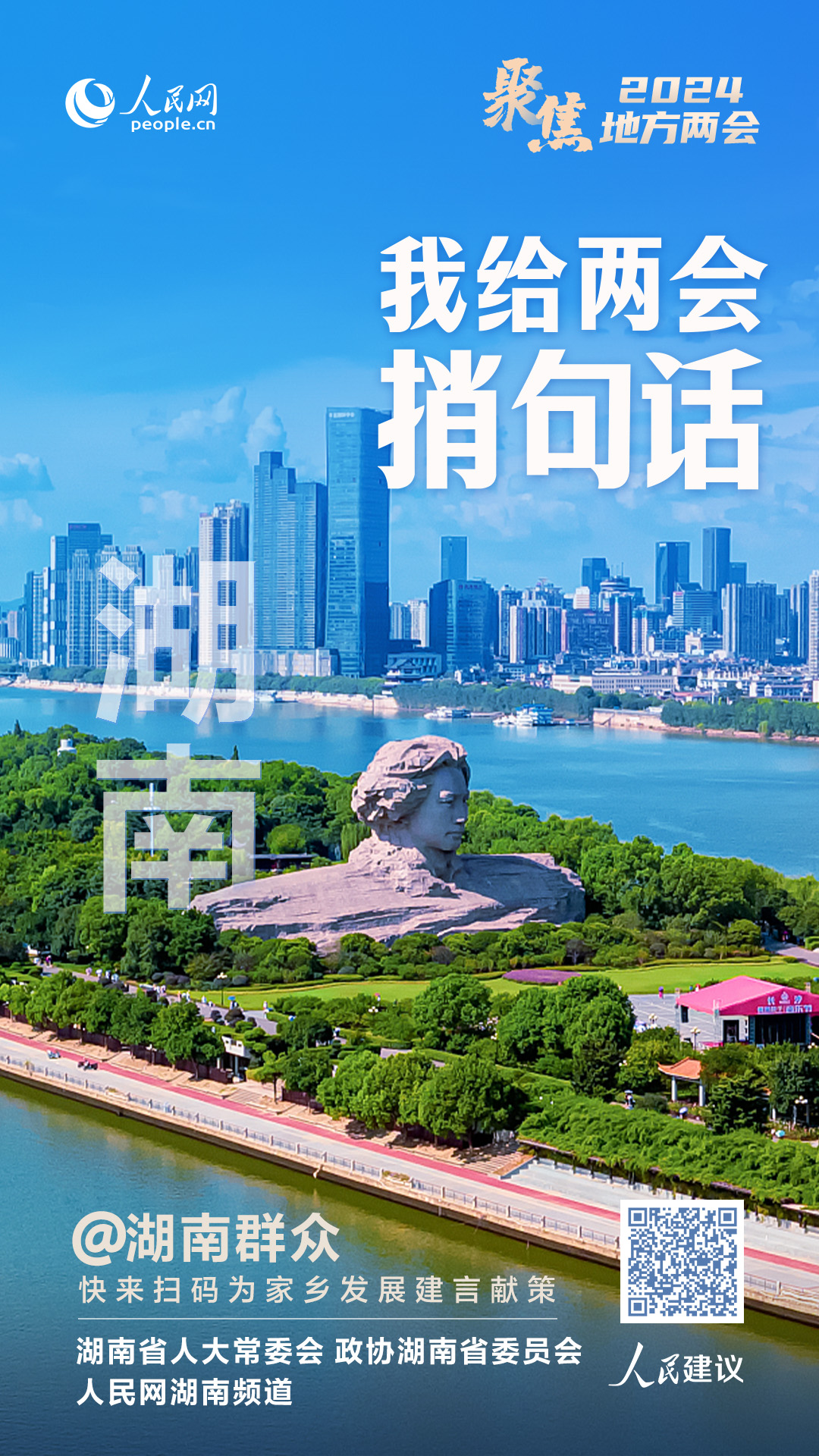 2024年1月23日,湖南省兩會召開。即日起,人民網(wǎng)聯(lián)合湖南人大常委會、政協(xié)湖南省委員會推出“我給湖南兩會捎句話”大型建言征集活動(簡稱“捎句話”活動),廣大網(wǎng)友可通過人民網(wǎng)“領(lǐng)導留言板”小程序、“人民網(wǎng)+”客戶端等渠道,為家鄉(xiāng)發(fā)展積極建言獻策。