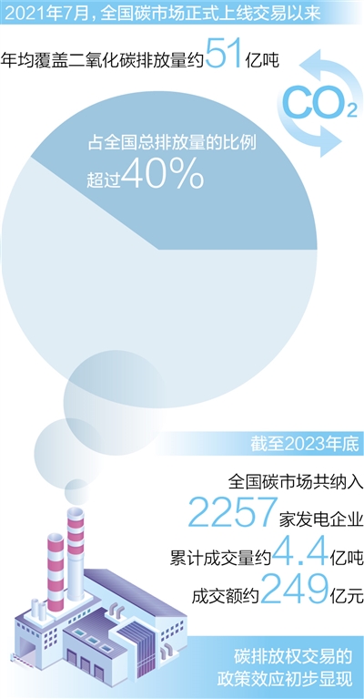 2021年7月全國(guó)碳市場(chǎng)正式上線交易以來,運(yùn)行整體平穩(wěn),年均覆蓋二氧化碳排放量約51億噸,占全國(guó)總排放量的比例超過40%。截至2023年底,全國(guó)碳市場(chǎng)共納入2257家發(fā)電企業(yè),累計(jì)成交量約4.4億噸,成交額約249億元,碳排放權(quán)交易的政策效應(yīng)初步顯現(xiàn)。
