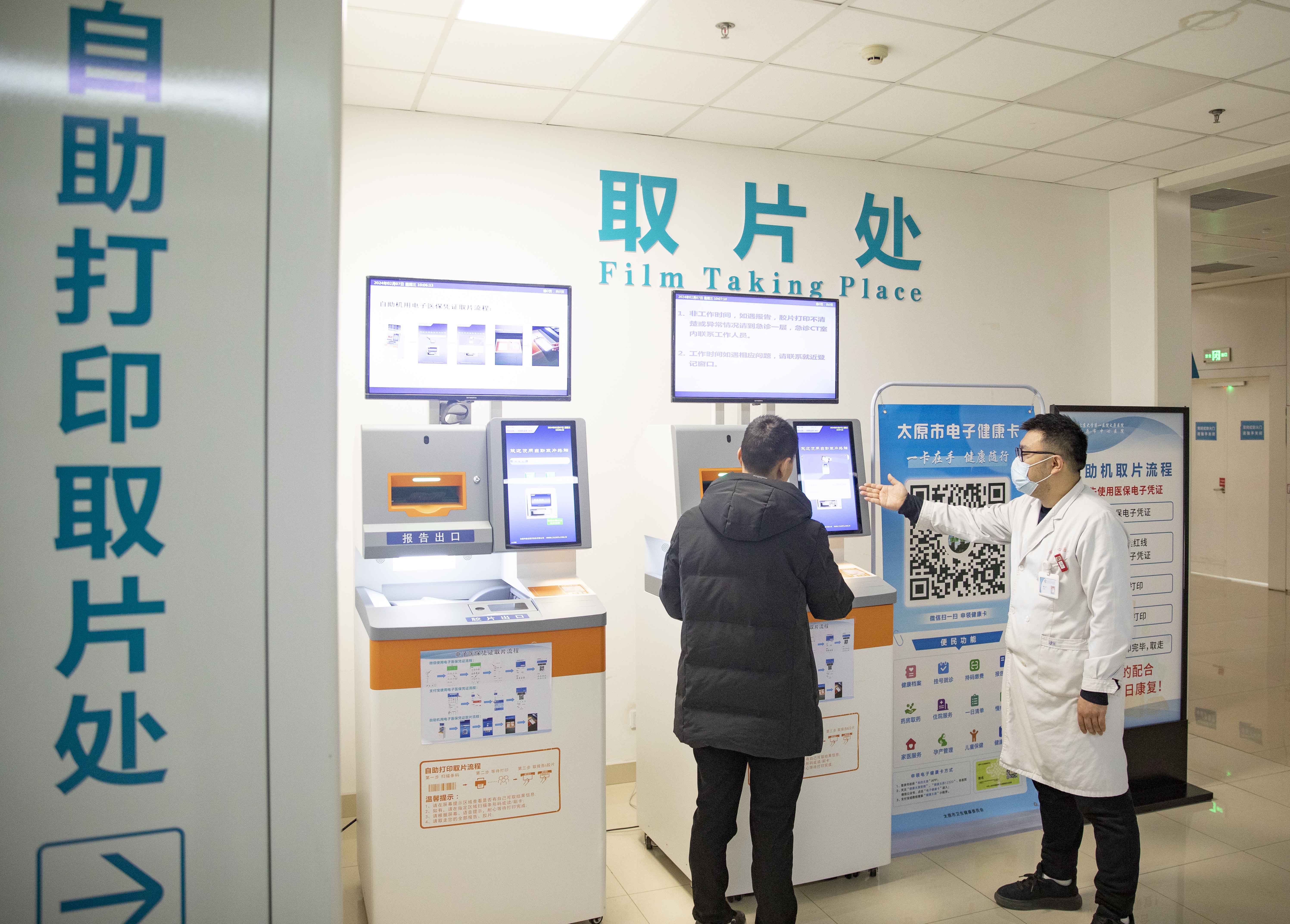 北大醫(yī)院太原醫(yī)院(市中心醫(yī)院)汾東院區(qū)醫(yī)護人員指導(dǎo)患者使電子健康卡自助掃碼取片。人民網(wǎng)記者王帆攝