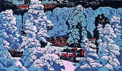 充滿粗獷刀味和雄渾之氣的色塊構(gòu)成,是晁楣版畫的魅力所在。他的藝術(shù)風(fēng)格從何而來?答案源于其在創(chuàng)作實(shí)踐中的自我體悟。在藝術(shù)創(chuàng)作中,晁楣深刻把握了藏與露、簡(jiǎn)與繁、整體與局部等多對(duì)概念之間的對(duì)立統(tǒng)一關(guān)系。與以人為主要表現(xiàn)對(duì)象的傳統(tǒng)黑白木刻有所不同,他的套色木刻以北大荒雄渾壯闊的風(fēng)景為主要題材。大色塊的構(gòu)成可以鮮明地表現(xiàn)山川、樹木的色彩關(guān)系,遠(yuǎn)景的人物因形象被縮小,化作外形概括的色塊,為畫面提供了精彩的細(xì)節(jié)。如《北方九月》《戰(zhàn)油?!贰都t裝素裹》《秋歌》《松谷》等作品,皆是在鳥瞰式的場(chǎng)景中以大色塊鋪陳畫面,再將人、鷹、馬、車等物象轉(zhuǎn)化為斑斕的色塊點(diǎn)綴其中,使得作品既有宏觀的場(chǎng)景表現(xiàn),亦有微觀的敘事呈現(xiàn),兩者相得益彰、相映成趣,呈現(xiàn)出濃郁的個(gè)人創(chuàng)作風(fēng)格。