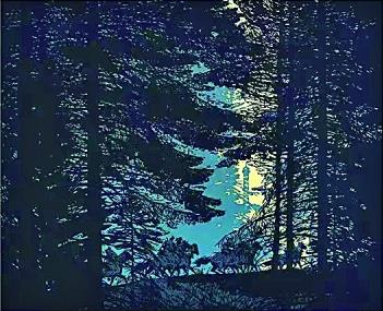 面對(duì)彼時(shí)套色木刻創(chuàng)作存在的這一問題,晁楣通過不懈研究與探索找到了解決的方法。他放棄了過去以黑線勾勒輪廓再以彩色填充的方式,大膽采用色塊拼接的新方法,將黑色與彩色并置在畫面中,使黑色輪廓線融入暗部,統(tǒng)一為一個(gè)個(gè)整體色塊。晁楣強(qiáng)調(diào),套色木刻中不能沒有黑色,因?yàn)樗诋嬅嬷邪l(fā)揮著重要的作用。這種“剪影式”的構(gòu)圖大量削減了輪廓線在畫面中的應(yīng)用,帶來強(qiáng)烈的色彩對(duì)比以及極具視覺張力的疏密關(guān)系,使得畫面結(jié)構(gòu)主次分明,保持了作品的整體感。試看晁楣的套色木刻作品《北陲屏障》,逆光的環(huán)境中,頂天立地、枝繁葉茂的松樹剪影占據(jù)了畫面的大部分空間,在遠(yuǎn)處光源的照耀下,一隊(duì)騎乘戰(zhàn)馬的巡邏兵疾馳而過,形成了動(dòng)靜交織的畫面節(jié)奏。作品用為數(shù)不多的色彩營(yíng)造光感,套色簡(jiǎn)潔自然,茂密枝干交織形成的無數(shù)小色塊,展現(xiàn)出藝術(shù)家精湛的運(yùn)刀技藝。