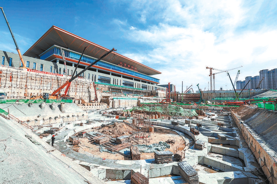 北京朝陽站交通樞紐項(xiàng)目14日完成雙環(huán)梁板混凝土澆筑。本報(bào)記者 潘之望攝