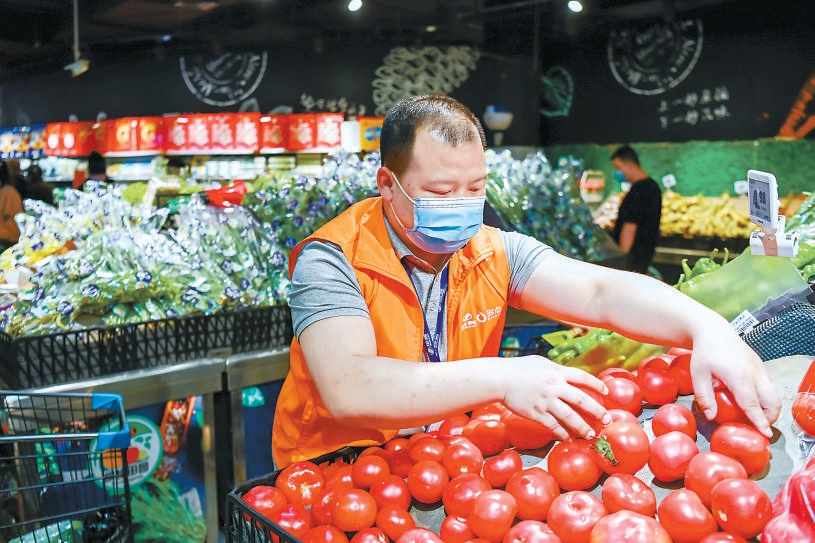 物美雙井店店長(zhǎng)宋飛飛在賣場(chǎng)查看蔬果銷售情況。本報(bào)記者 鄧偉攝