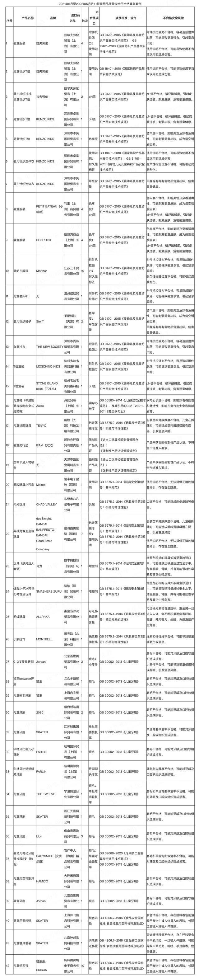 央廣網(wǎng)北京6月1日消息 據(jù)海關(guān)總署網(wǎng)站消息,6月1日,海關(guān)總署通報2021年6月至2022年5月間檢出的部分進口嬰童用品質(zhì)量安全不合格典型案例,包括服裝、童鞋、玩具、牙刷、食品接觸產(chǎn)品等5類82批次進口嬰童用品,涉及拉夫勞倫、KENZO KIDS、ZARA和獅王等多個品牌產(chǎn)品。