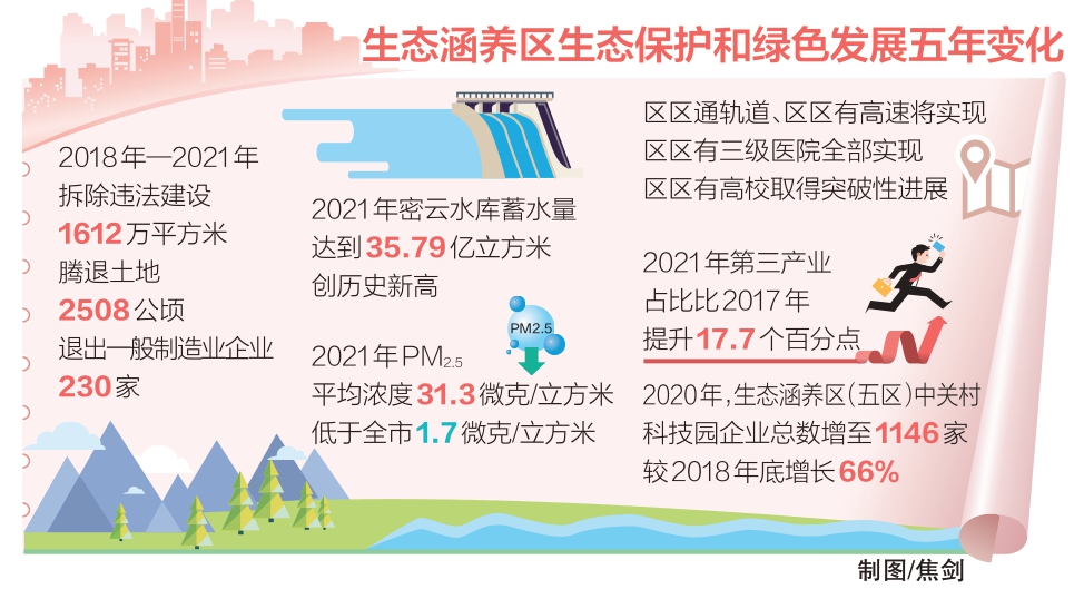 數(shù)據(jù)顯示,2018年到2021年,生態(tài)涵養(yǎng)區(qū)累計(jì)拆除違法建設(shè)1612萬平方米、騰退土地2508公頃、退出一般制造業(yè)企業(yè)230家。