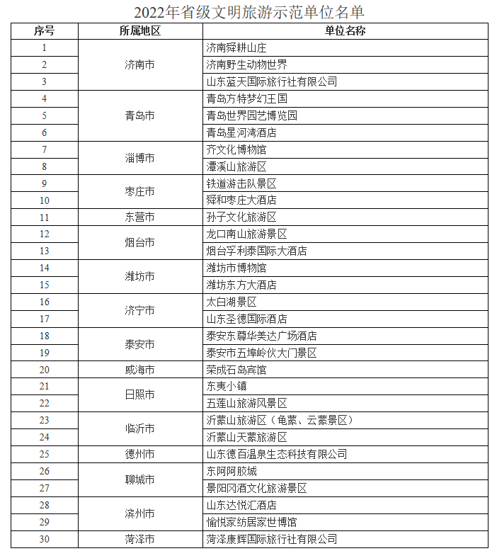 山東省認(rèn)定30家單位為2022年省級文明旅游示范單位
