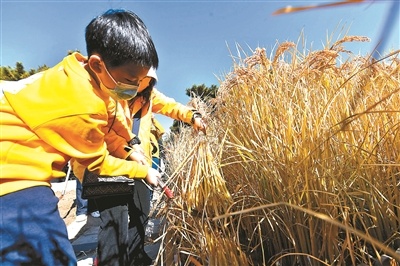 昨天上午,北京青年報(bào)記者來(lái)到先農(nóng)壇,觀耕臺(tái)前的一畝三分地上,水稻已經(jīng)成熟,稻穗在陽(yáng)光下隨風(fēng)搖曳,煥發(fā)出金燦燦的光澤,構(gòu)成獨(dú)特的古都秋景。隨著主持人開(kāi)鑼、小朋友們齊喊“豐收嘍”,收割儀式正式開(kāi)始。在場(chǎng)嘉賓和10名小朋友一起收割第一鐮新稻子,寓意豐收碩果新開(kāi)始。