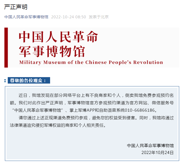 近日部分網(wǎng)絡(luò)平臺(tái)上有商家和個(gè)人倒賣該館免費(fèi)參觀預(yù)約名額。對(duì)此,軍博嚴(yán)正聲明,該館參觀預(yù)約渠道為官方網(wǎng)站、微信服務(wù)號(hào)“中國(guó)人民革命軍事博物館”、掌上軍博APP和自助語(yǔ)音系統(tǒng)010-66866186。觀眾要通過(guò)上述正規(guī)渠道免費(fèi)預(yù)約參觀,避免權(quán)益受到侵害。同時(shí),該館將通過(guò)法律渠道追究侵犯軍博權(quán)益的商家和個(gè)人相關(guān)責(zé)任。