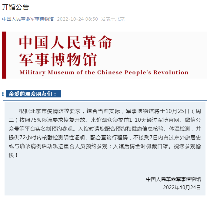 中國(guó)人民革命軍事博物館10月24日發(fā)布公告,該館將于25日(周二)按照75%限流要求恢復(fù)開放。
