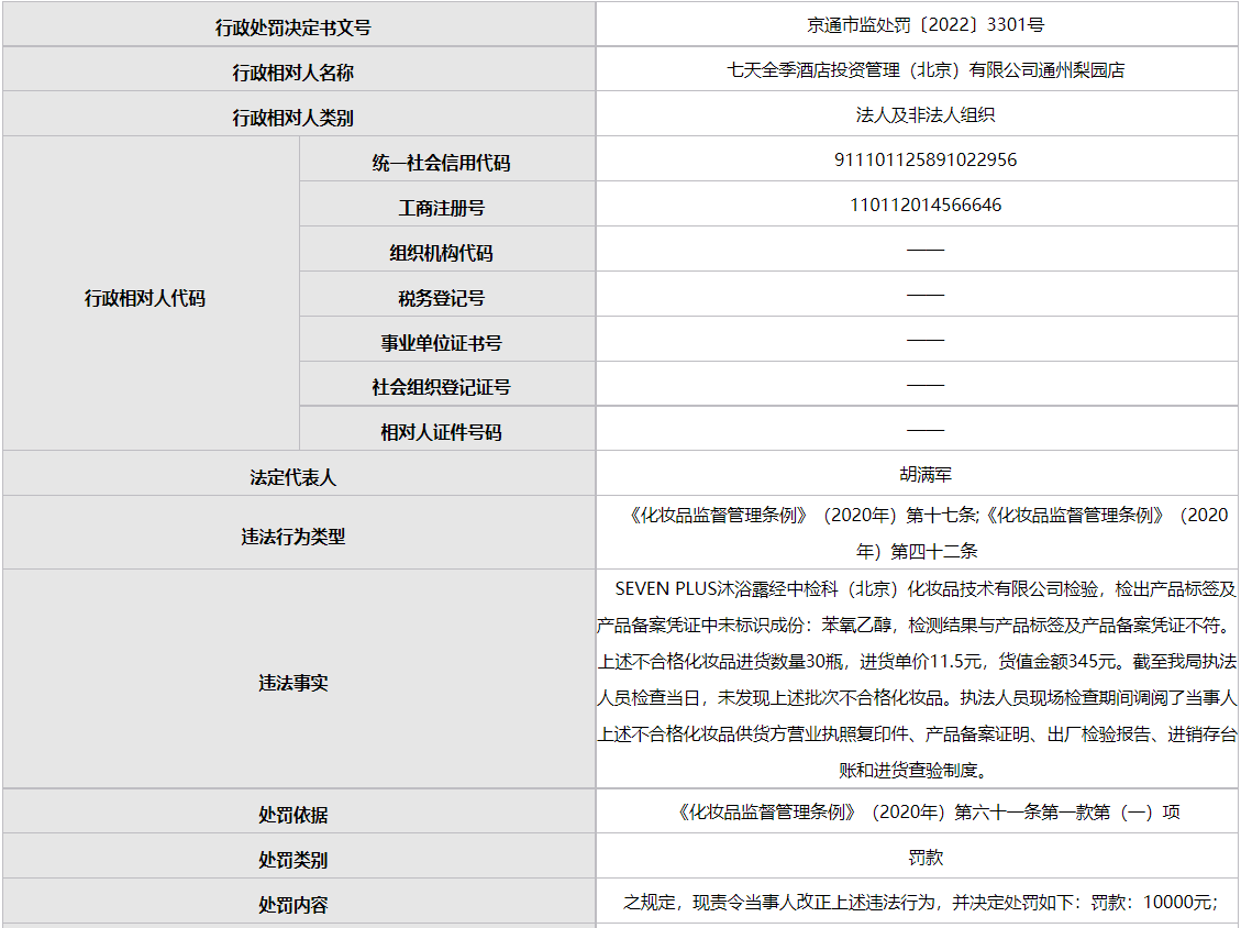 據(jù)文號為“京通市監(jiān)處罰〔2022〕3301號”行政處罰決定書顯示,七天酒店梨園店具體違法事實為:SEVEN PLUS沐浴露經中檢科(北京)化妝品技術有限公司檢驗,檢出產品標簽及產品備案憑證中未標識成份:苯氧乙醇,檢測結果與產品標簽及產品備案憑證不符。上述不合格化妝品進貨數(shù)量30瓶,進貨單價11.5元,貨值金額345元。