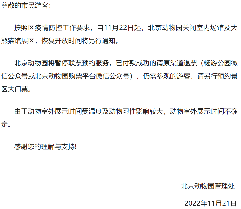 北京動物園管理處發(fā)布通知,按照西城區(qū)疫情防控工作要求,自11月22日起,北京動物園關(guān)閉室內(nèi)場館及大熊貓館展區(qū),恢復(fù)開放時間另行通知。