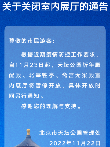 11月23日,北京市天壇公園管理處發(fā)布關(guān)于關(guān)閉室內(nèi)展廳的通告,自11月23日起,天壇公園祈年殿配殿、北宰牲亭、齋宮無梁殿室內(nèi)展廳暫停開放,具體開放時間另行通知。