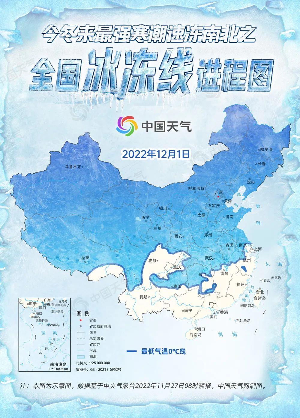 12月1日早晨,冰凍線基本南壓至本次過程最南端,也是今冬以來最南端,安徽南部、貴州南部、湖南南部一帶最低氣溫將首次跌破冰點,合肥、貴陽、南京將體驗冰點以下的滋味,冰凍范圍將覆蓋我國超8成國土。