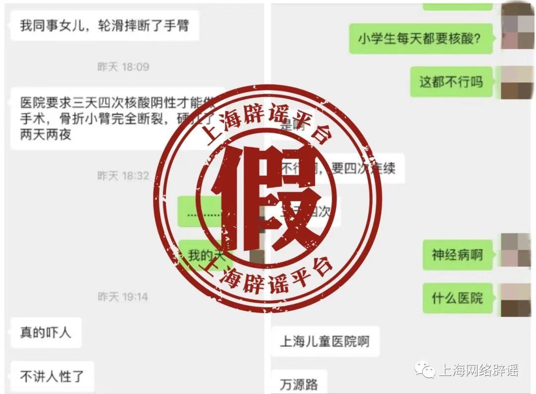 “上海一醫(yī)院要求兒童三天四次核酸才能做手術(shù),孩子骨折小臂斷裂,硬抗了兩天兩夜。”不久前,一條聊天記錄在陸先生的家屬群引發(fā)熱議。因為表姐一家生活在上海,親戚還特意提醒她照顧好孩子。而很快,官方發(fā)布辟謠消息,稱經(jīng)過多路求證,聊天記錄中所指醫(yī)院并沒有三天四次核酸檢測陰性才能手術(shù)的要求,院方也未核查到存在所傳相似情況的病人。