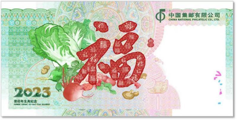 紀(jì)念券背面主景采用多個“福”字的組合,寓意著新的一年福氣連連、福滿門。背景團(tuán)花中有玉兔搗藥的圖案,表達(dá)了疫情之下祈求健康、幸福的真摯愿望。白菜、蘿卜、蘑菇也都有著各自的深意,比如白菜諧音“百財”,且有清白之意;蘿卜在閩南方言叫“菜頭”,諧音彩頭;蘑菇則象征蓬勃向上的生命力量。這些看似普通的元素給人以親切之感,更寓意著源源不斷的財運(yùn)、好運(yùn)和幸運(yùn)。