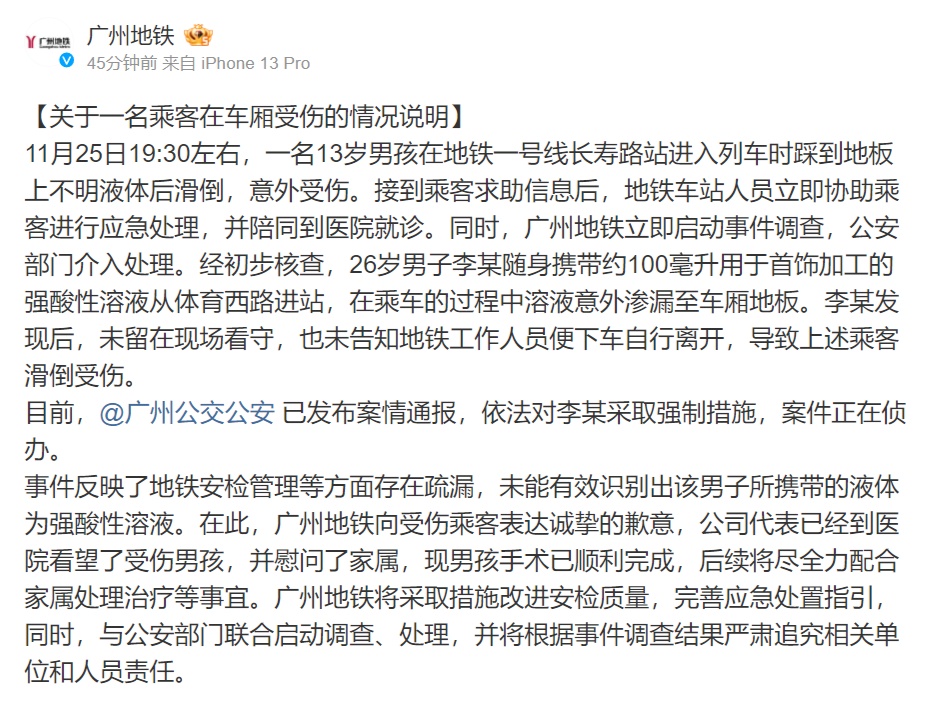 廣州地鐵方面表示,事件反映了地鐵安檢管理等方面存在疏漏,未能有效識別出該男子所攜帶的液體為強酸性溶液,向受傷乘客表達誠摯的歉意。廣州地鐵公司代表已經到醫(yī)院看望了受傷男孩,并慰問了家屬,現男孩手術已順利完成,后續(xù)將盡全力配合家屬處理治療等事宜。